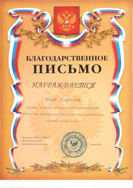 11 декабря 2017 г. в Илекской центральной районной библиотеке в рамках празднования «Дня героев» состоялось награждение участников проекта «Живые улицы». Благодарственными письмами и ценными подарками была отмечена творческая группа Студенческого научного общества Илекского зоотехнического техникума, создавшая видеоролик, посвященный жизненному пути Героя Советского Союза В.А. Сорокина – имя которого носит одна из новых улиц села Илек. Поздравляем ребят и желаем им во всем успехов.