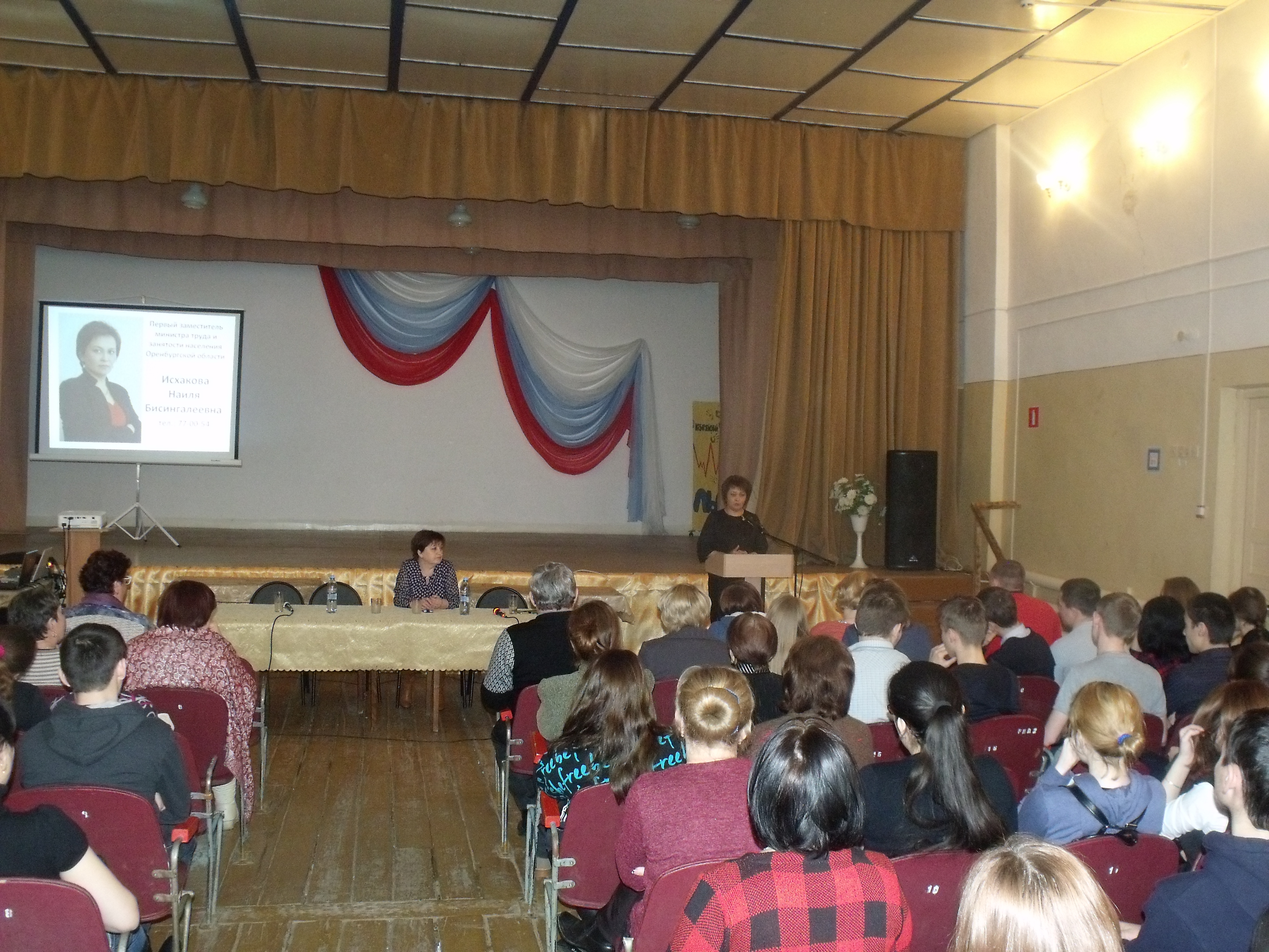 В Илекский зоотехнический техникум была приглашена гостья Исхакова Наиля Бисингалеевна - первый заместитель министра труда и занятости населения Оренбургской области. Гостья рассказала сотрудникам и студентам техникума о социально-экономическом состоянии предприятий Оренбургской области и мероприятиях, реализуемых органами исполнительной власти по дальнейшему развитию региона.