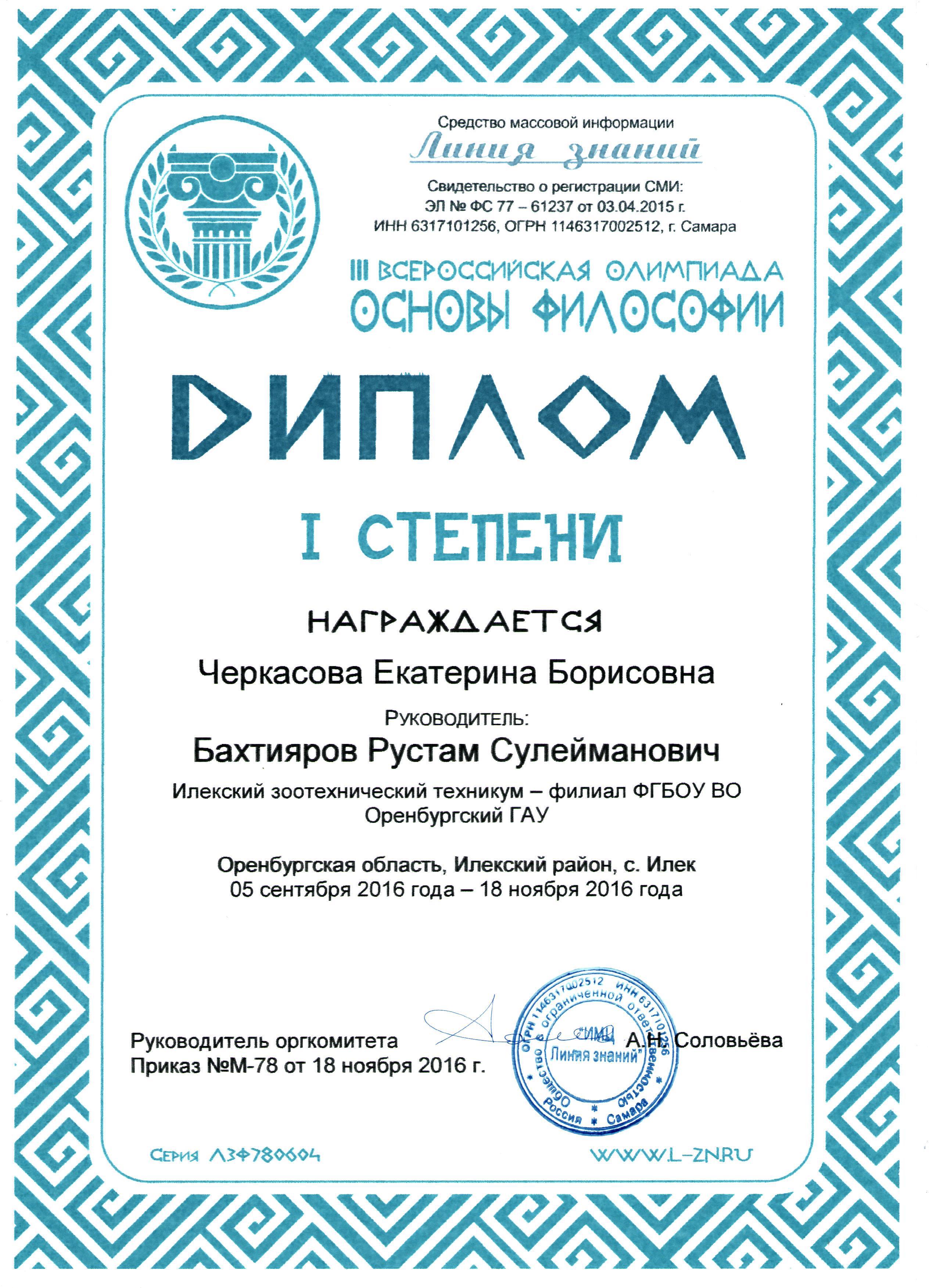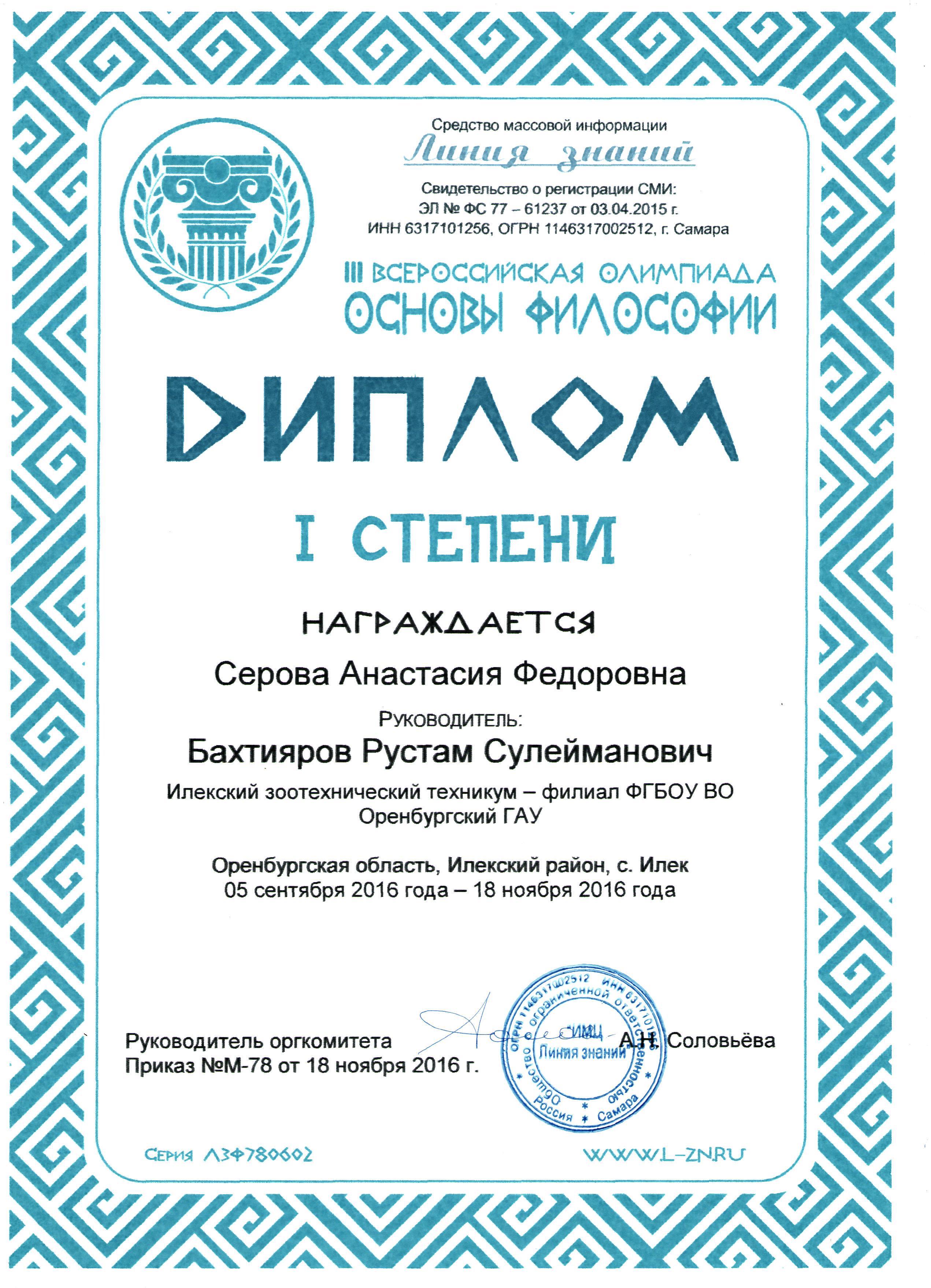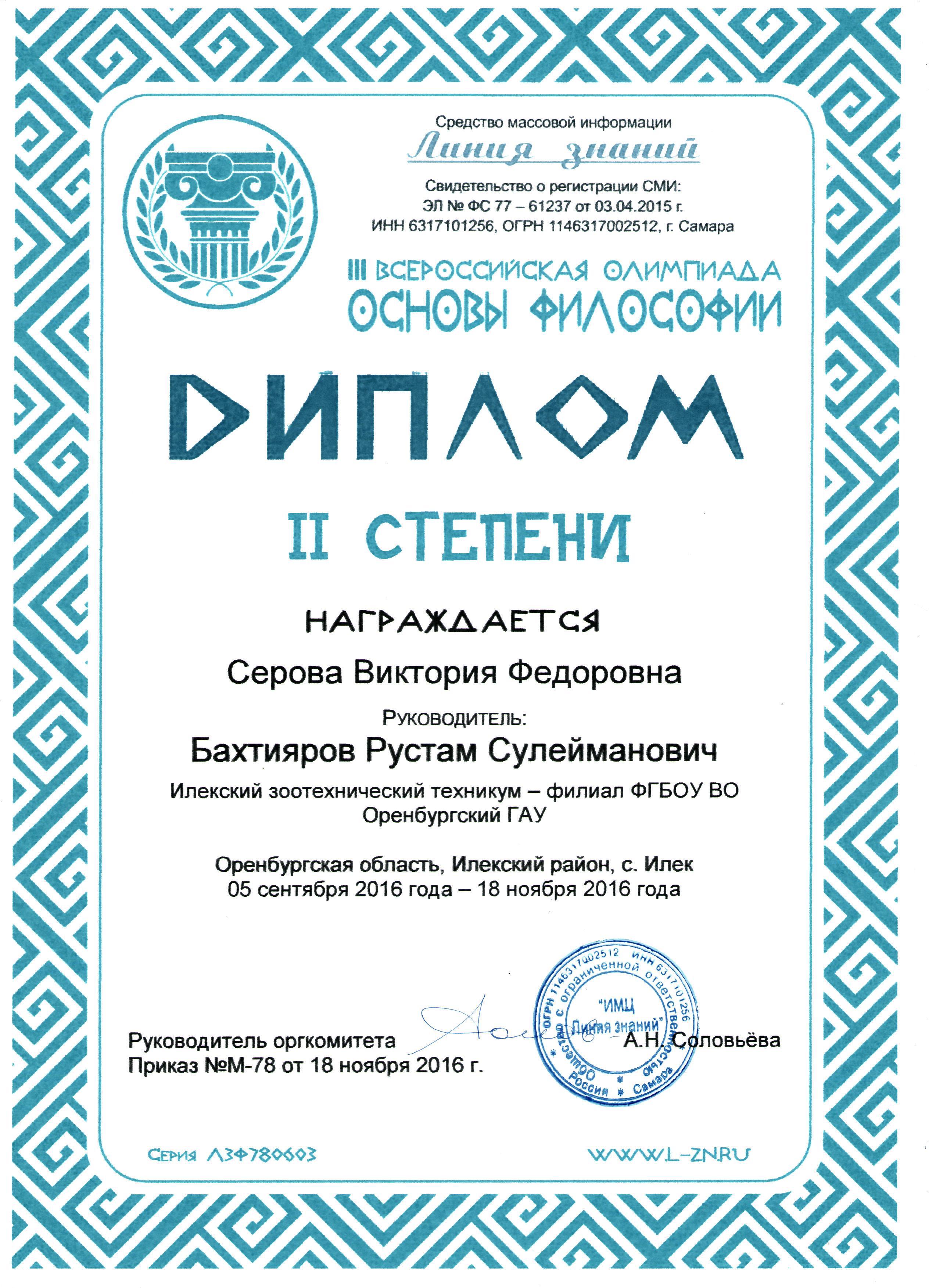 Так, в октябре этого года группа студентов техникума под руководством преподавателя философии Р.С. Бахтиярова приняла участие в третьей всероссийской олимпиаде по основам философии. По итогам олимпиады были получены 4 диплома 1-й степени и 2 диплома 2-й степени.