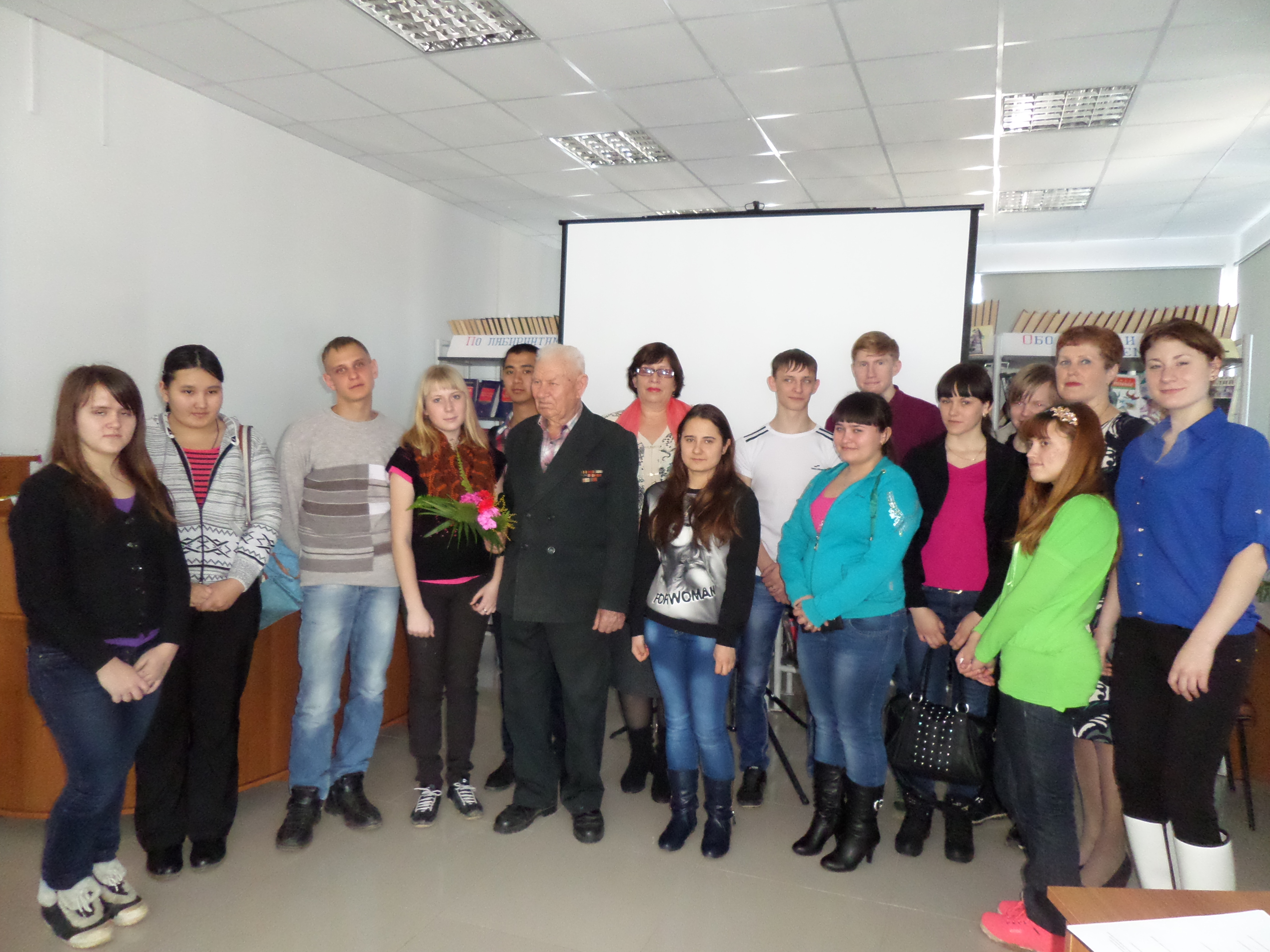 1 курса Илекского зоотехнического техникума-филиала ФГБО ВПО Оренбургский ГАУ с ветераном Великой Отечественной войны, младшим лейтенантом Георгием Михайловичем Веретиным .